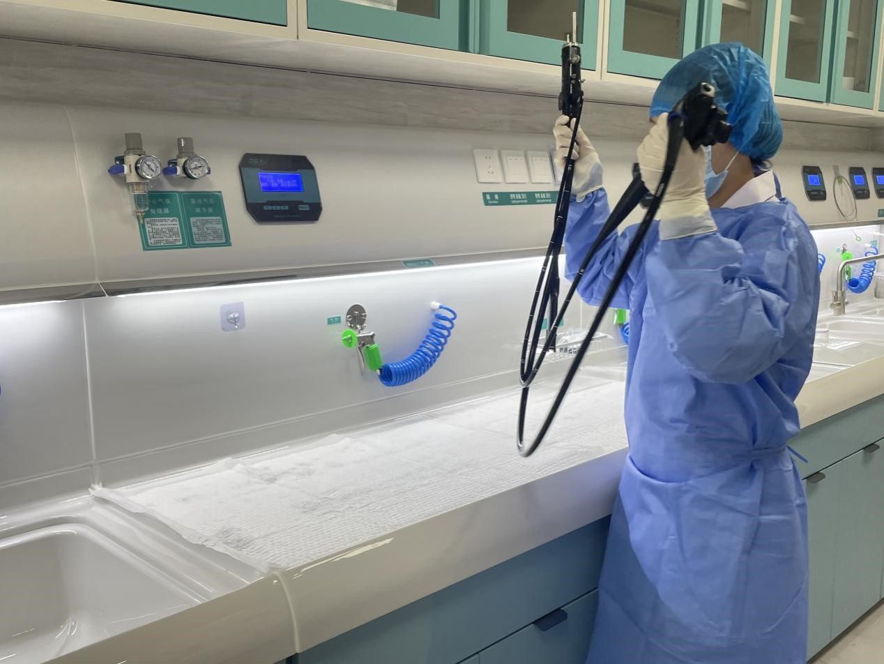 检查医生以娴熟且轻柔的手法进行精确操作;清洗消毒设备在洗消护士的熟练操控下飞速旋转,确保设备洁净无菌;检查结束后,护士悉心陪护患者,并将其安全稳妥地带到家属身旁。整个流程严谨细致,确保患者拥有安全与舒适的就诊体验。