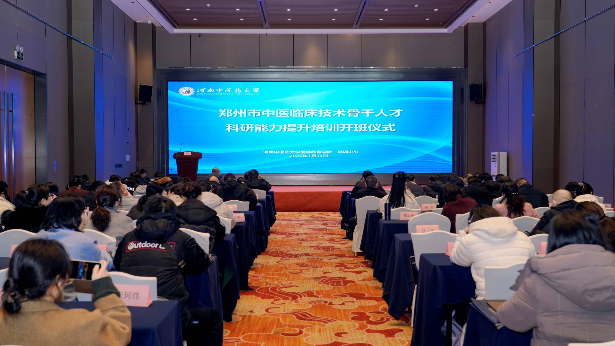 本网讯(文/图 翟慧婧)为深入贯彻落实国家及郑州市关于中医药传承创新发展的战略部署,系统提升中医临床骨干人才的科研素养与创新能力,2026年1月14日,“郑州市中医临床技术骨干人才科研能力提升培训”正式开班,来自全市的100名中医临床技术骨干参加。郑州市中医院副院长李冬玉,河南中医药大学社会合作办公室(继续教育管理办公室)副主任王守东,河南中医药大学继续教育学院院长、培训中心主任纪宝玉等出席开班仪式。仪式由河南中医药大学继续教育学院副院长、培训中心副主任徐强主持。